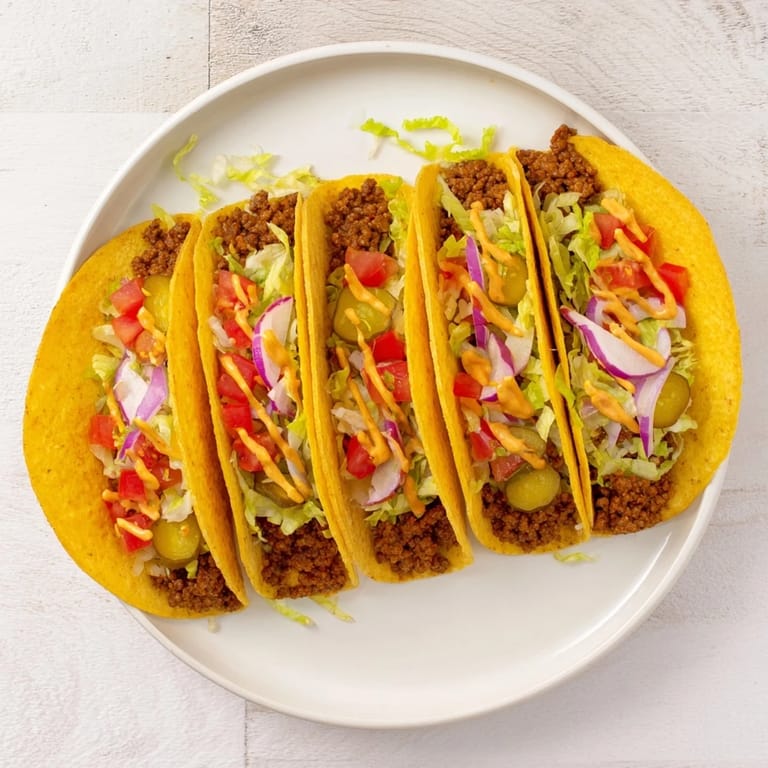 - Fill each taco with shredded lettuce, tomato, pickles, and red onion. Drizzle with burger sauce.