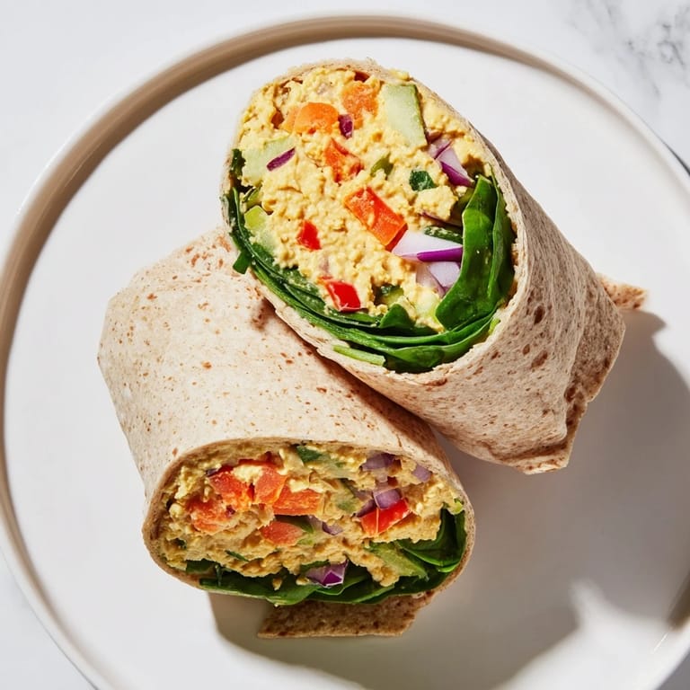 Save A vibrant protein-packed plant-based wrap featuring creamy mashed chickpeas and crunchy fresh vegetables perfect for meal prep quick lunches or light dinners.