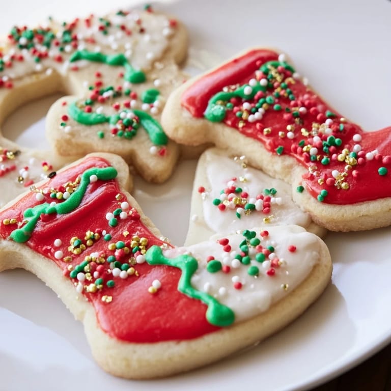 Save Festive, whimsical cookies shaped like Christmas boots, perfect for holiday gatherings. These buttery vanilla cookies are decorated with colorful icing for a joyful touch.