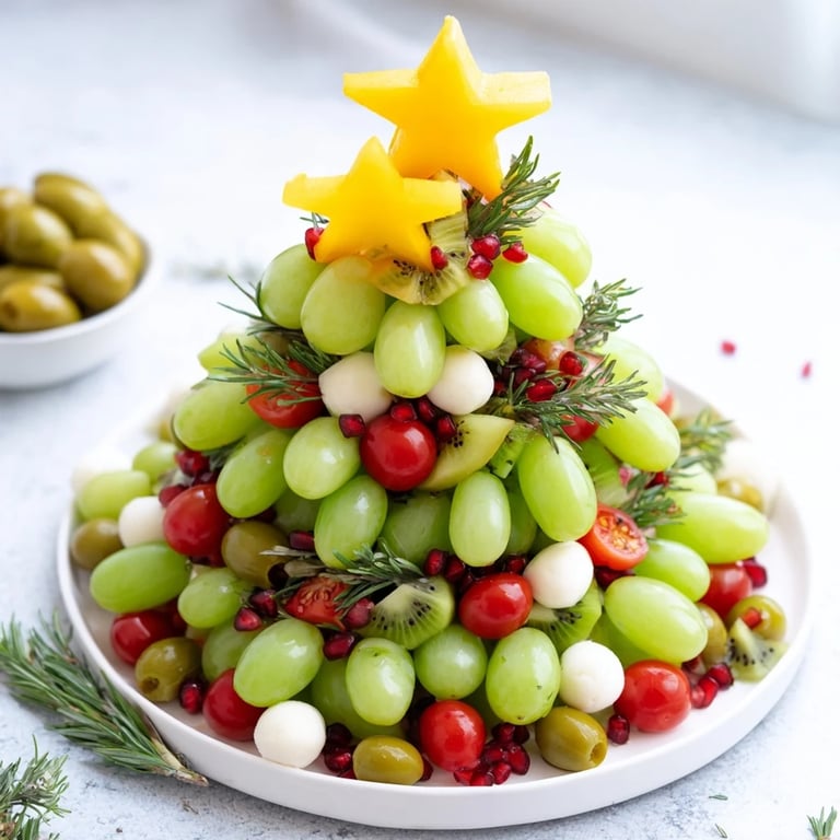 - 1/2 cup red grapes, halved: Halving them lets them tuck into spaces the whole grapes can't reach, creating visual abundance and making the tree look full and festive