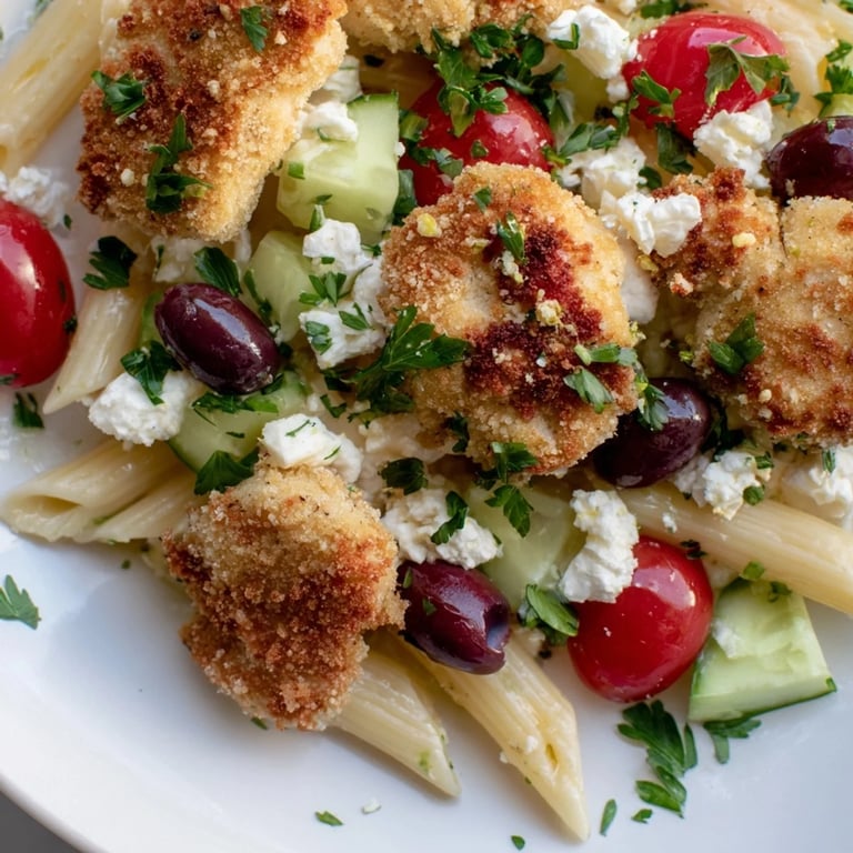 - Add the cooked pasta to the salad bowl and toss well so the dressing clings to every piece. Top with the crispy chicken bites, garnish with extra feta and parsley, and serve immediately while the chicken is still crunchy.