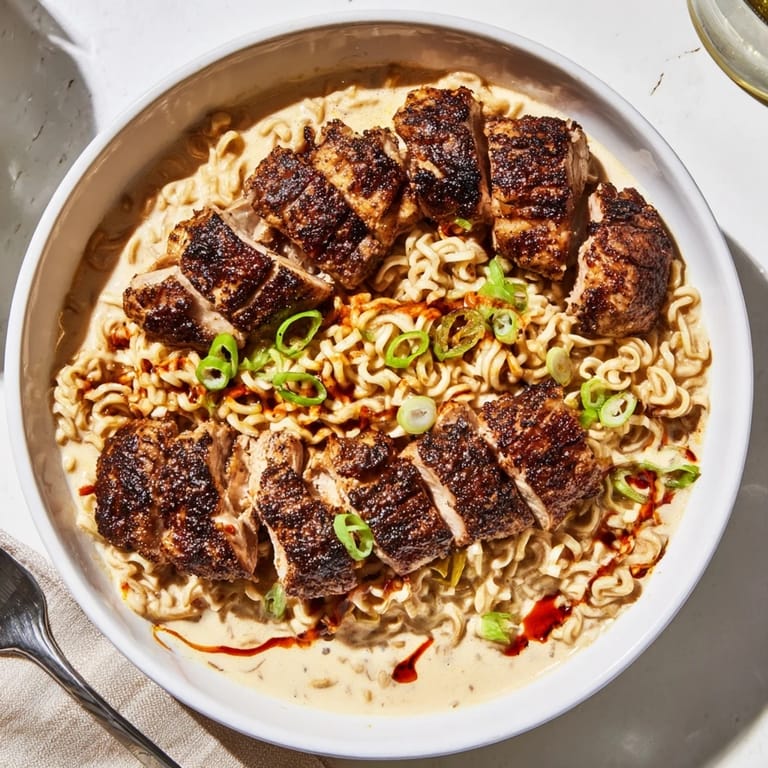 Save This Fiery Chicken Ramen with Creamy Garlic Sauce is a bold and flavorful dish perfect for spice lovers. Juicy, spice-rubbed chicken is seared to perfection and served over a rich, creamy broth with chewy ramen noodles. A drizzle of garlicky sauce balances the heat, creating a comforting and satisfying meal. Whether you're looking for a restaurant-style ramen at home or a new favorite comfort food, this dish delivers!