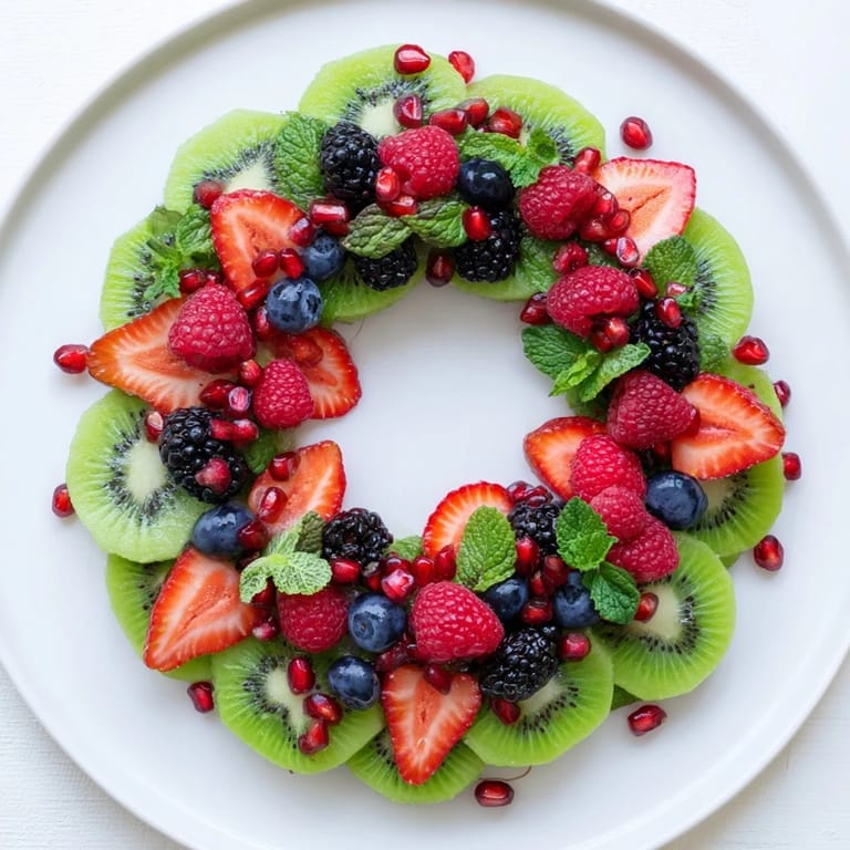 Save A festive and vibrant fruit platter arranged in the shape of a wreath featuring juicy kiwi slices and an assortment of fresh berries& perfect for holiday gatherings.