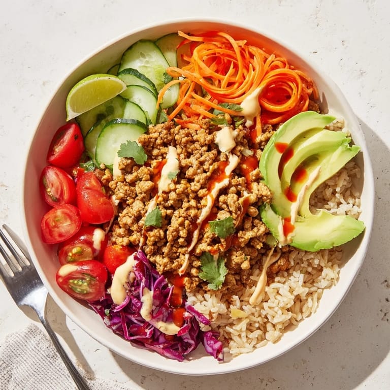 - Bowl Base & Toppings: 200 g cooked brown rice or quinoa, 1 large avocado, sliced, 1 medium carrot, julienned, 1 small cucumber, thinly sliced, 100 g red cabbage, shredded, 100 g cherry tomatoes, halved, 2 tbsp fresh cilantro, chopped, 1 lime, cut into wedges
