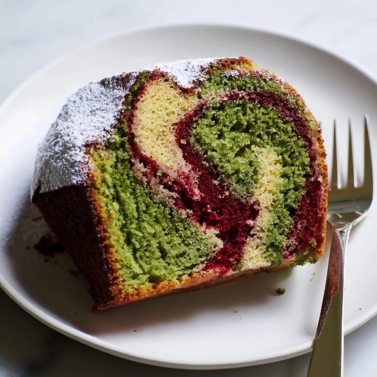 Save A visually stunning and deliciously moist pound cake featuring vibrant swirls of matcha and ruby-red berry flavors, perfect for teatime or as a festive treat.
