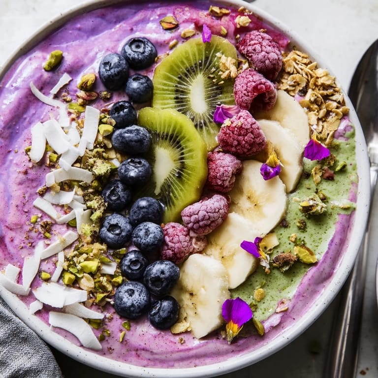 Bursting with color and flavor, this vibrant breakfast bowl blends steamed purple yam, bananas, and pistachios for a creamy, nutrient-rich base. A vivid mix of berries, kiwi, granola, and coconut flakes adds visual appeal and texture. Simply steam the yam, blend with other ingredients, and top with fresh toppings for a satisfying fusion dish. Plant-based yogurt and nut butter variations offer flexibility for dietary needs, while edible flowers boost presentation. This easy, gluten-free option delivers energizing nutrients in every spoonfulβ€”perfect for brightening your morning.